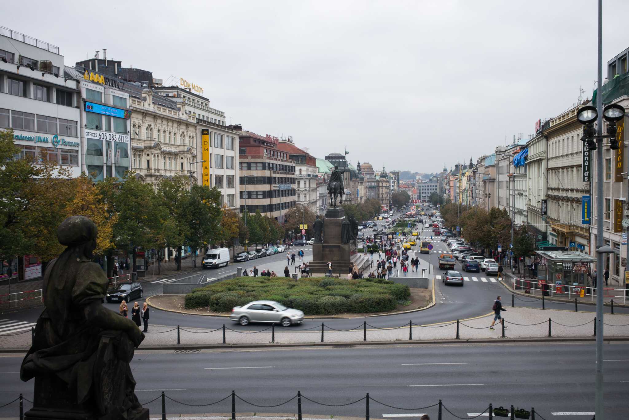 Václavské náměstí, které jsem se snažil zachytit z přibližně stejného místa jako Josef Koudelka na své fotografii s hodinkama z roku 1968.