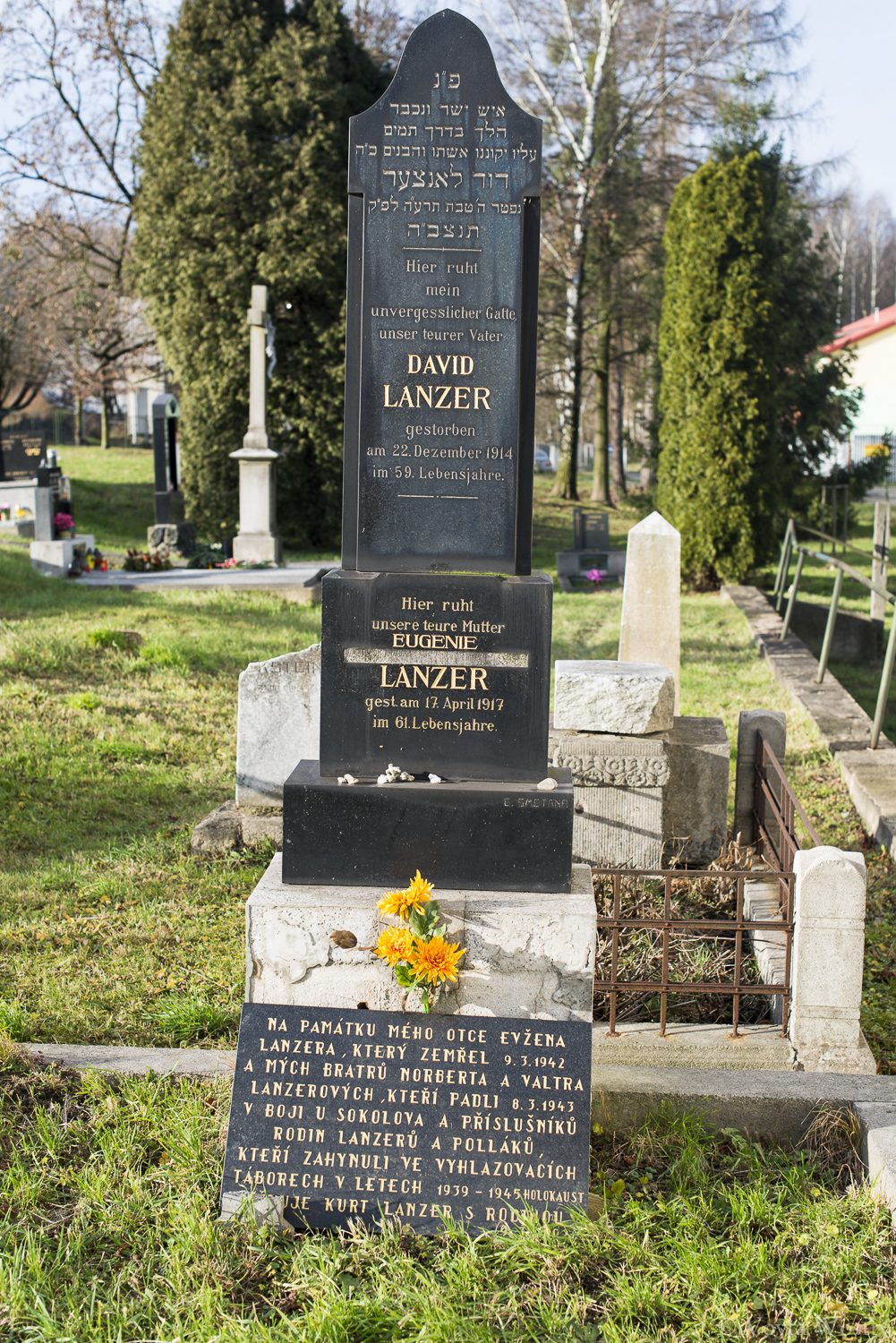 Hier ruht mein unvergesslicher Gatte, unser teurer Vater David Lanzer gestorben am 22. Dezember 1914 im 59. Lebensjahre. Hier ruht insere teure Mutter Eugenie Lanzer gest. am 17. April 1917 im 61. Lebensjahre. E. Smetana